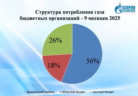 За счет Программы развития газоснабжения и газификации Курганской области на 2021-2025 гг. и президентской программы догазификации, реализуемых при поддержке правительства региона, растет число потребителей природного газа. Так, в 2025 увеличилось до 126 количество потребителей природного газа из числа бюджетных организаций. За отчетный период этого года в структуре потребления преобладают учреждения федерального уровня (56%), на организации местных бюджетов приходится 26%, на областные – 18%.