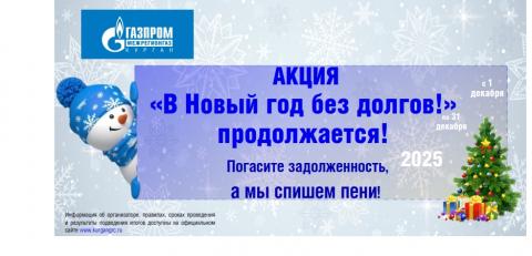 «В преддверии Нового года призываем потребителей газа погасить долги. Понимая, что по разным причинам может быть накоплена задолженность, предлагаем своим абонентам принять участие в акции по списанию пеней и сэкономить», - прокомментировал Анатолий Лисицын, заместитель генерального директора по работе с социально значимой категорией потребителей «Газпром межрегионгаз Курган».